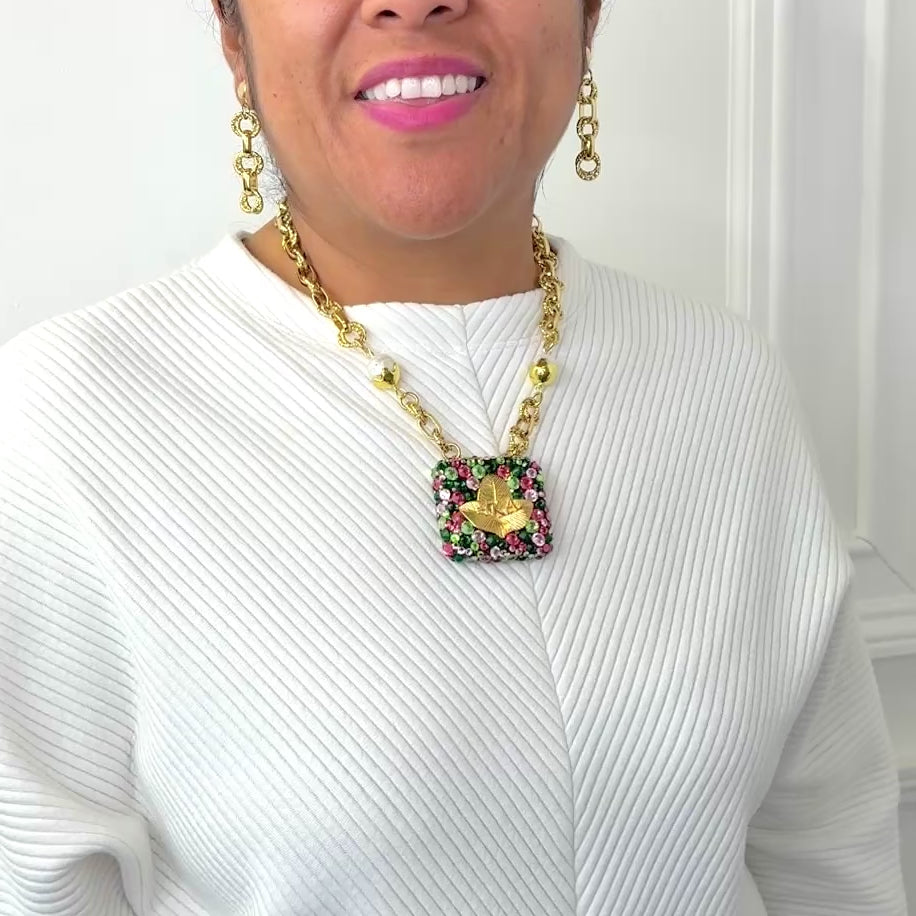 AKA Vibrant Pink and Green Square Hand-Embellished Swarovski Crystal Pendant with Double Round Interlocking Necklace Earring Set. Pendant is double sided. Necklace Earring Set ONE-OF-A-KIND DESIGN.