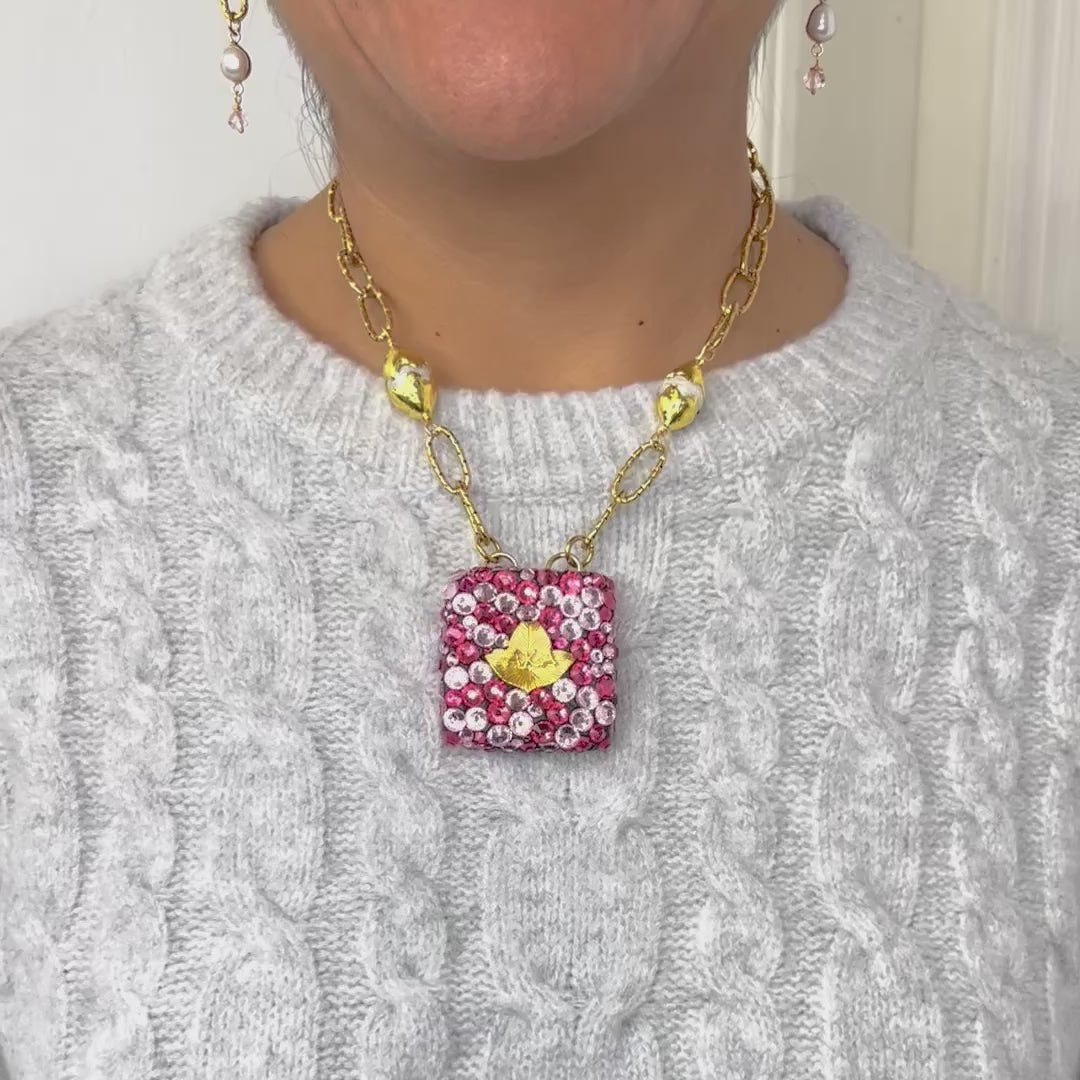 AKA Vibrant Pink Green hand Embellished Swarovski Crystal Pendant Chain Necklace Earring Set. AKA Ivy Leaf charm, double sided.