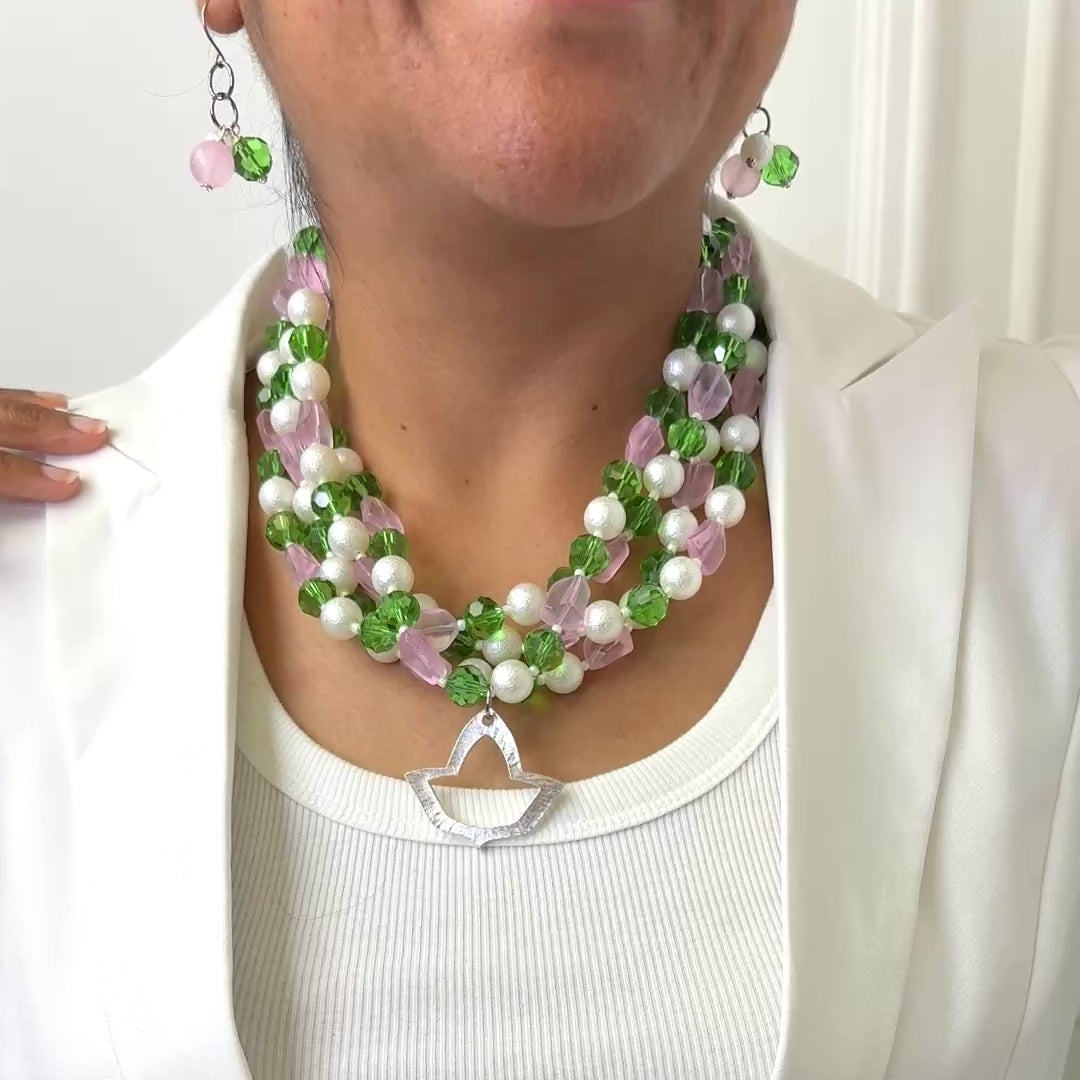 AKA Frosted Pink Glass, Green Crystal, and Faux Pearl 4-strand Necklace and Earring Set.