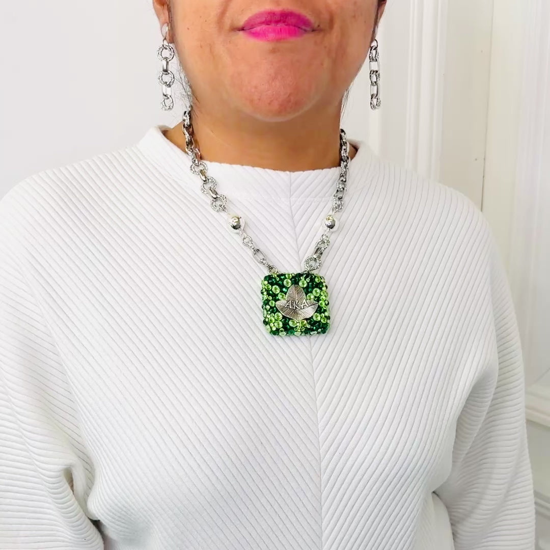 AKA Vibrant Green Square Hand-Embellished Swarovski Crystal Pendant with Double Round Interlocking Necklace Earring Set. Pendant is double sided. Necklace Earring Set ONE-OF-A-KIND DESIGN.