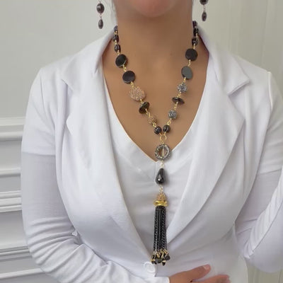 Black Onyx, Agate Tassel Necklace Necklace Earring Set