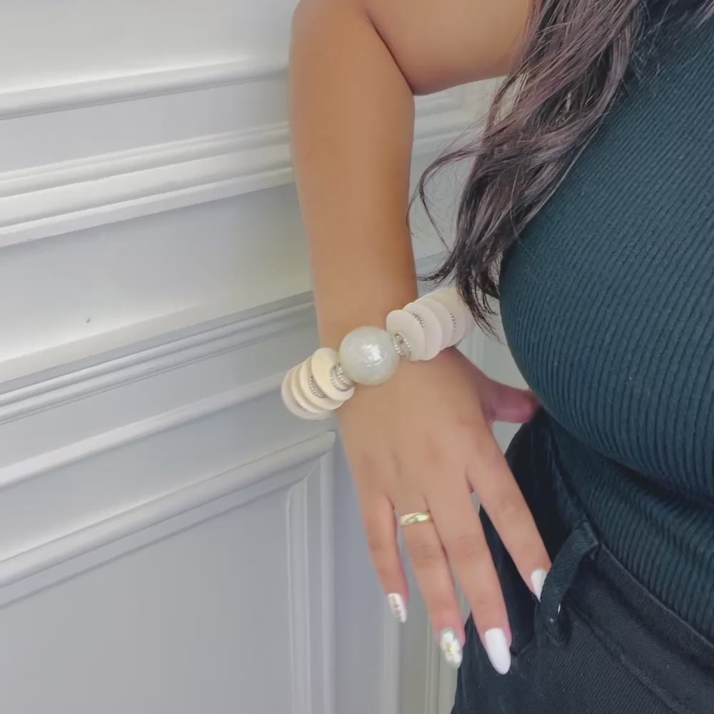 White Wood Discs, Metal Accented Stretch Bracelet