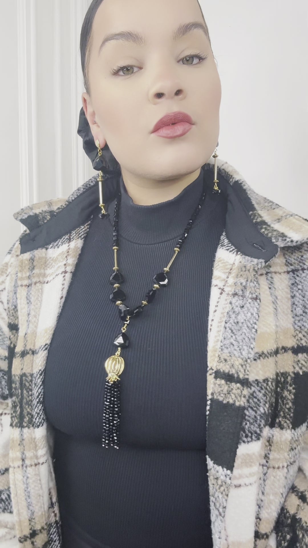 Black Crystal Tassel Necklace. Necklace Earring Set