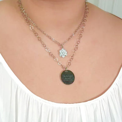 "She Believed She Could, So She Did" Silver Circle Dainty Chain with Rose & Coin Pendant Set of 2 Necklaces. Can be worn separately.
