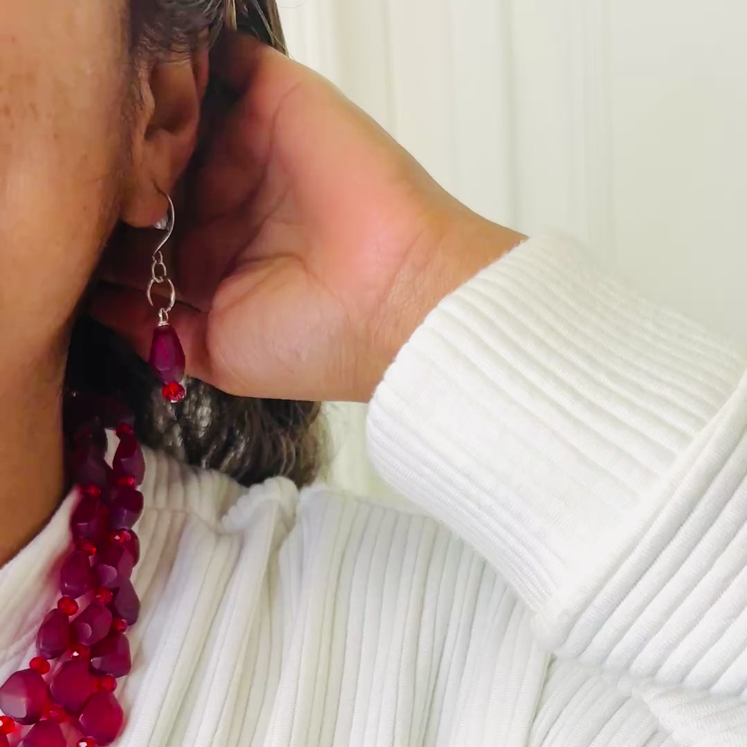 Delta Sigma Theta Red Frosted Glass and Crystal, 3-Strand Necklace and Earring Set.