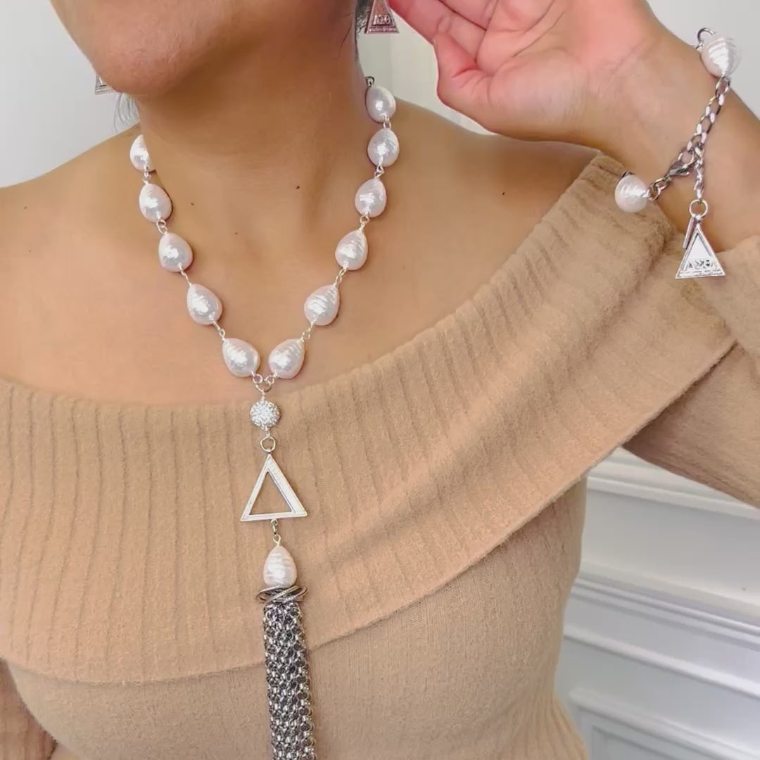 Delta Sigma Theta White Ribbed Shell Pearl Tassel Necklace