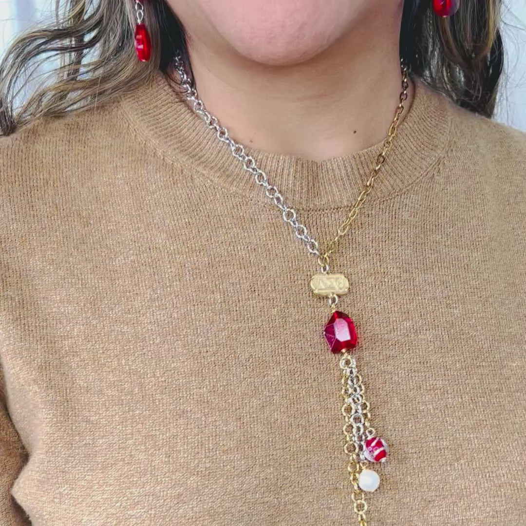Delta Sigma Theta Dainty Two-Tone Gold & Silver Necklace with Red Crystal & Pearl Tassel