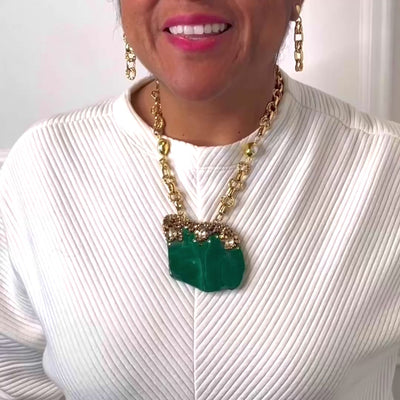 Large Green Natural Malachite Gemstone Pendant with Pearl Chain Accent Necklace Earring Set. Outstanding Hand Embellished with Swarovski Crystals.