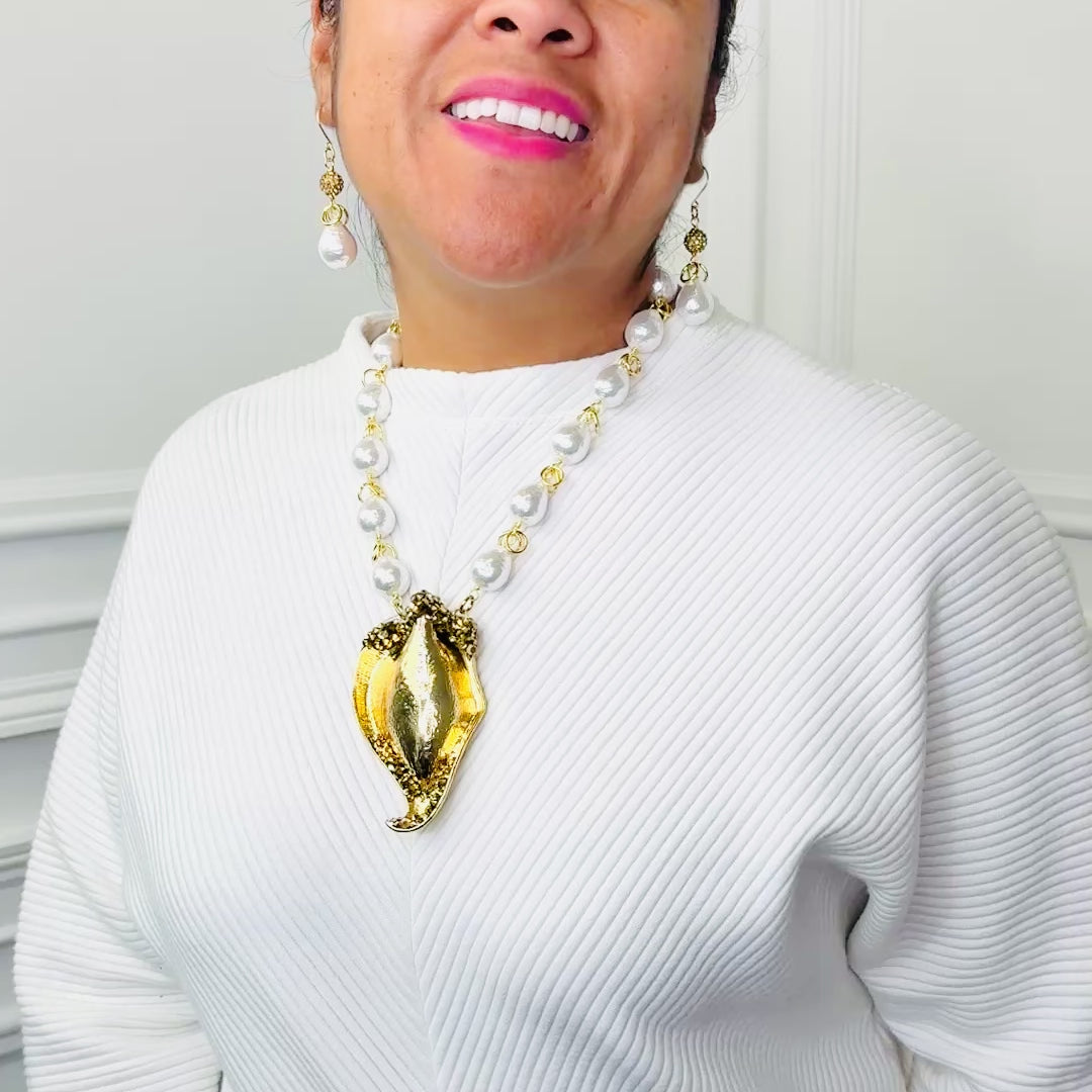 White Shell Pearl Teardrop Necklace with Vintage Leaf Pendant Embellished with Swarovski Crystals.