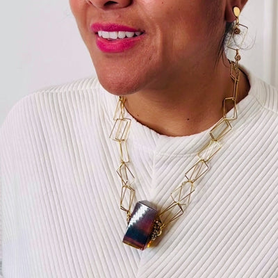 Natural Citrine on Geometric Chain Necklace. Swarovski Crystal embellished Gemstone pendant.