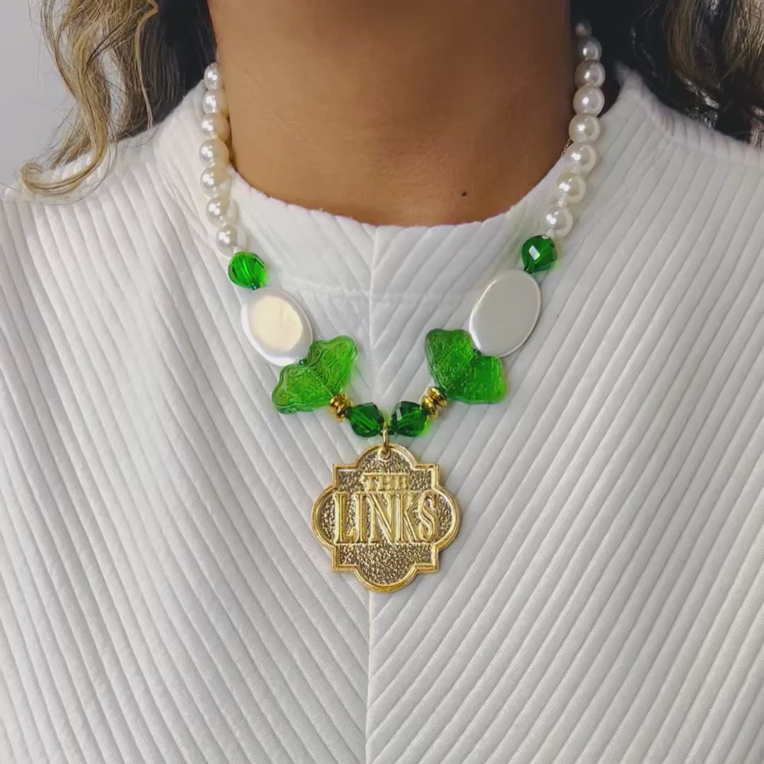 The Links, Inc. White Shell Pearl, Green Carved Glass and Crystal Necklace