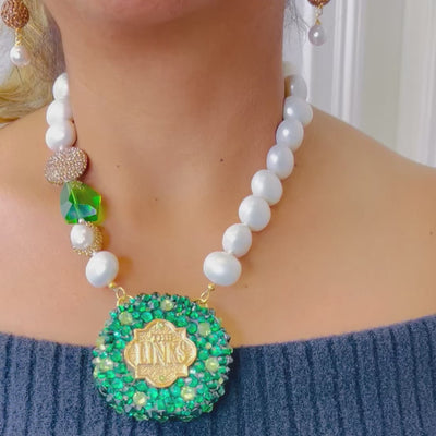 The Links, Inc. Vibrant Green hand Embellished Swarovski Crystal Pendant, large oval shell pearl Necklace Earring Set, double sided. Few of a kind.