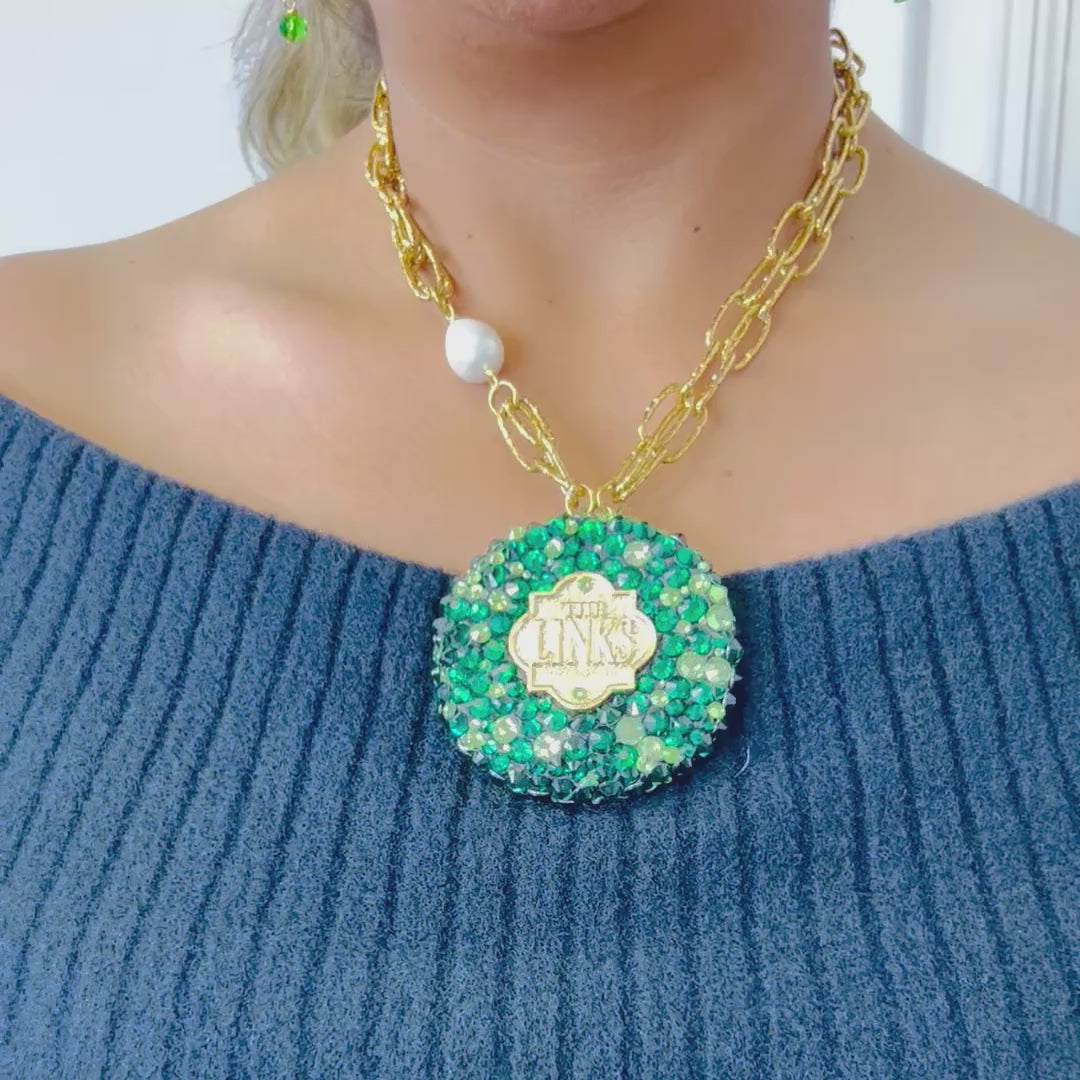 The Links Inc. Green Hand Embellished Swarovski Crystal Round Pendant Chain Necklace Earring Set. Radiant charm, double sided.