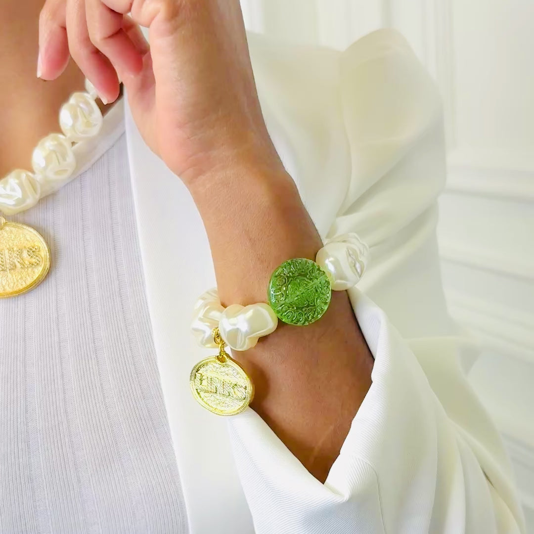 The Links, Inc. Faux Baroque Pearl, Green Carved Glass Necklace/Bracelet Set. Sold as set.
