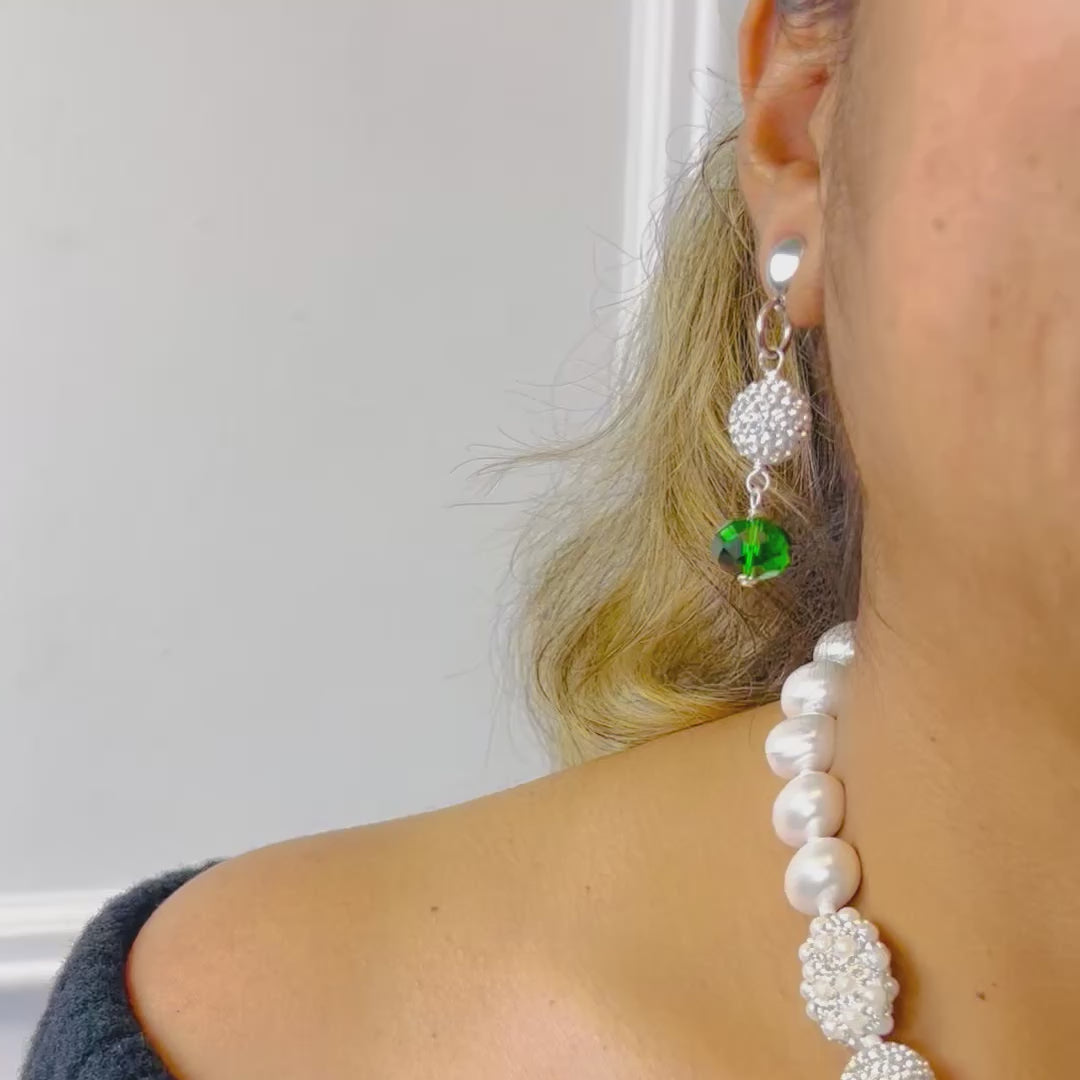 Links Green hand Embellished Swarovski Crystal Pendant, medium oval shell pearl Necklace Earring Set, double sided.