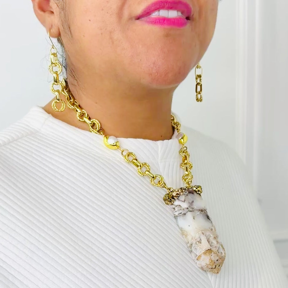 White and Brown Agate Druzy Point Pendant Necklace with Chain and Freshwater Pearl.