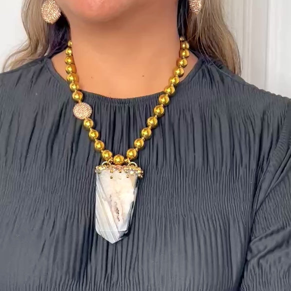 White & Brown Agate Druzy Point Pendant and Gold Hematite Necklace.