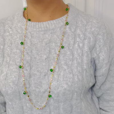 AKA Pink Crystal Chain with Green Cube Crystal Accent Necklace. Gold Accents