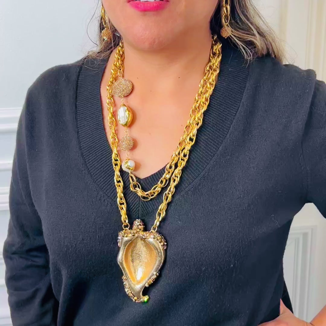 Rope Double Strand Chain with Embellished Pave Swarovski Crystal Flower Lily Pendant Necklace. . Also Freshwater Pearl Accent