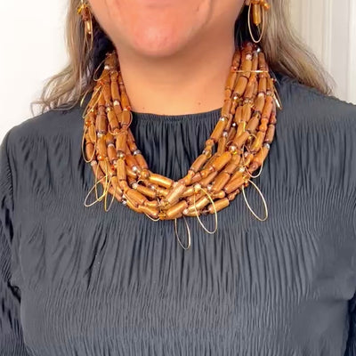 This exquisite coordinated set pairs a multi-strand necklace with matching earrings, both showcasing warm gold sponge coral accented by delicate oval wire details. The layered composition and refined metalwork create an understated elegance perfect for the discerning wearer seeking timeless sophistication.