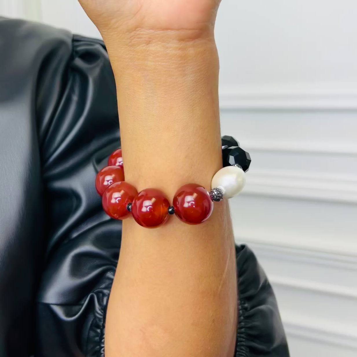 Burnt Orange Carnelian and Shell Pearl and Black Crystal Necklace Bracelet Earring Set