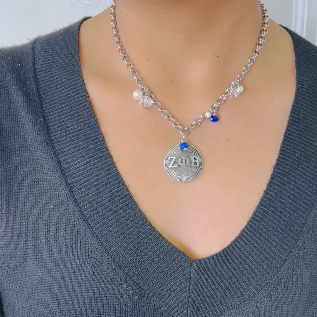 Zeta Phi Beta Blue and Clear Crystal, Pearl, Pave Chain Necklace.