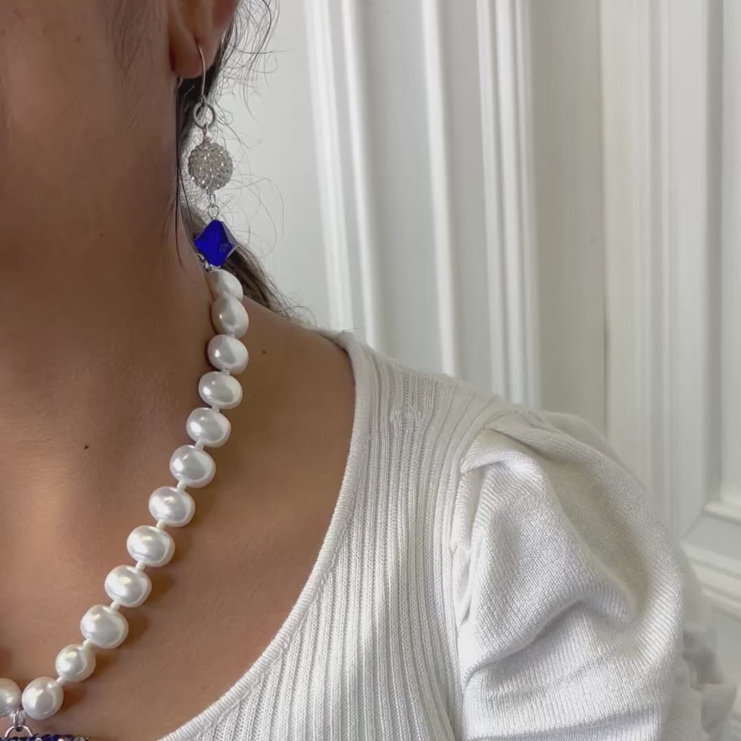 Zeta Phi Beta Vibrant Blue hand Embellished Swarovski Crystal Pendant, medium oval shell pearl Necklace Earring Set, double sided.