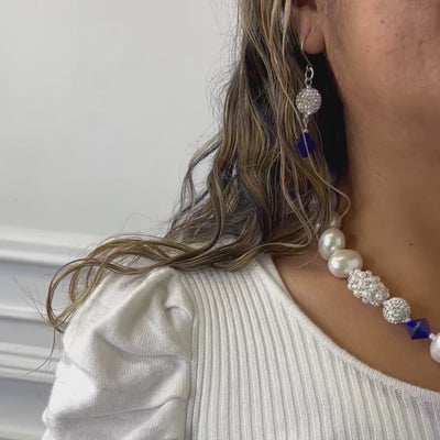 Zeta Phi Beta Vibrant Blue hand Embellished Swarovski Crystal Pendant, large oval shell pearl Necklace Earring Set, double sided.