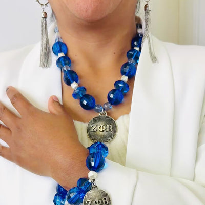 Zeta Phi Beta Blue and Pearl Acrylic Necklace Bracelet Set