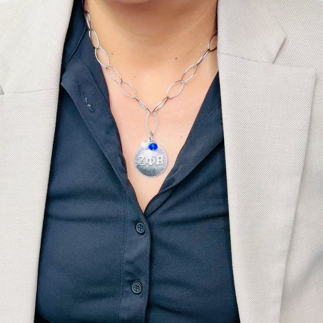 Zeta Phi Beta Blue Crystal and White Pearl Oval Chain Necklace.
