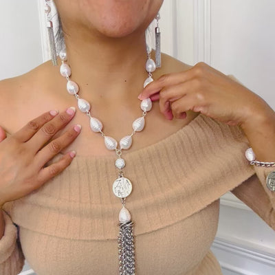 Zeta Phi Beta White Ribbed Shell Pearl Tassel Necklace